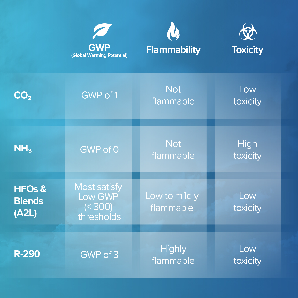 CO₂ leads the charge in low GWP adoption because it’s a natural refrigerant and provides little risk in terms of toxicity or flammability. Also, with a GWP of 1, it’s essentially future proof for any regulations in place now or to come. Many CO₂ refrigerant systems are already on the market.
